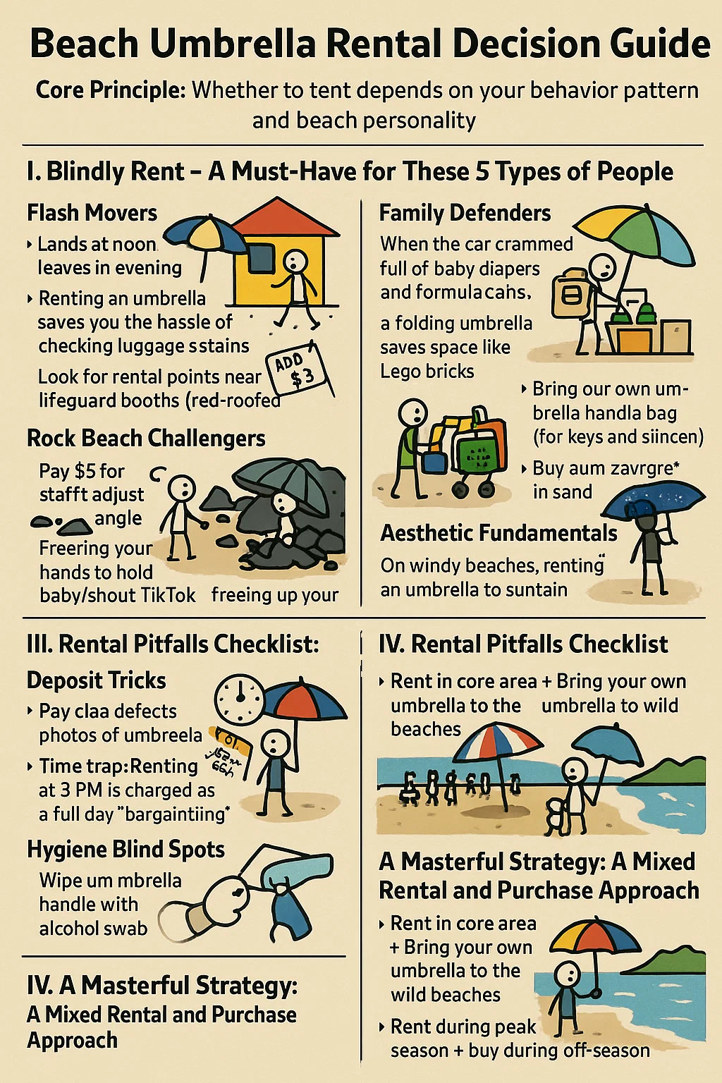 Flash Movers: Aterizează la prânz, pleacă seara → Închirierea unei umbrele vă scutește de bătaia de cap de a verifica bagajele. Căutați puncte de închiriere în apropierea cabinelor de salvamar (cabane cu acoperiș roșu, cu pereți galbeni). Puneți bonul de depozit în carcasa telefonului pentru a preveni pierderea.