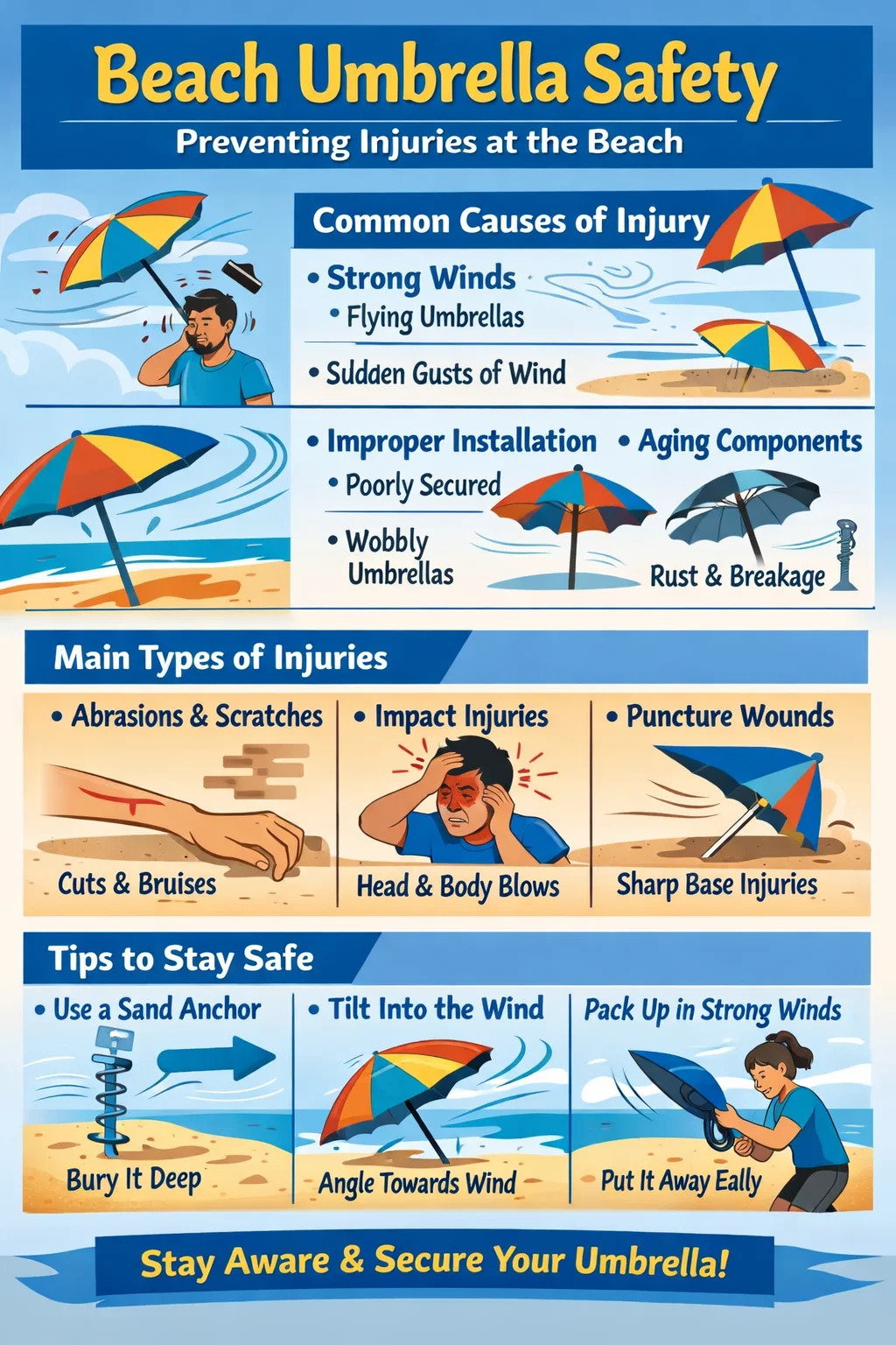 Deși aceste tipuri de accidente sună îngrijorătoare, cele mai multe pot fi evitate complet luând câteva minute suplimentare pentru a vă asigura corect umbrela de plajă.
