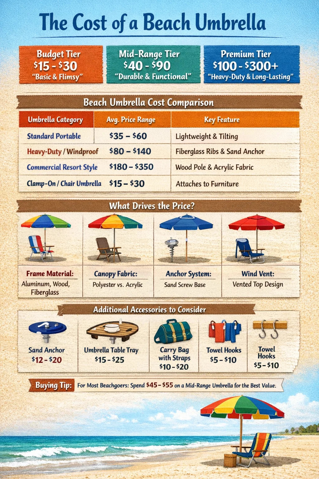 Pentru călătorul ocazional care ajunge la plajă de două ori pe an, cheltuind 45 USD până la 55 USD pe un interval mediu umbrela de plaja este „punctul favorabil”. Oferă suficientă durabilitate pentru a face față brizelor tipice de pe malul mării fără a sparge banca. Dacă locuiți la distanță de mers cu mașina de ocean și planificați vizite săptămânale, investiți 120 USD sau mai mult într-un model rezistent cu nervuri din fibră de sticlă vă va economisi bani și frustrare pe termen lung.