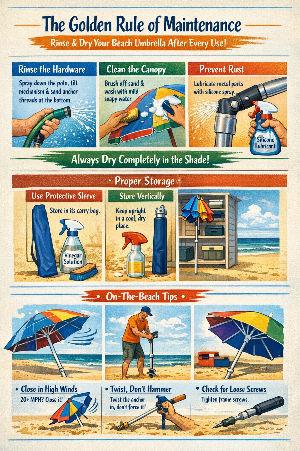 Pentru umbrele cu stalpi metalici, aplicand a lubrifiant siliconic de calitate marine la articulații de două ori pe sezon poate preveni efectul de „blocare” cauzat de oxidare. Nu utilizați niciodată WD-40 pentru depozitare pe termen lung, deoarece poate atrage mai mult praf și nisip; lipiți-vă de spray-uri uscate de silicon.