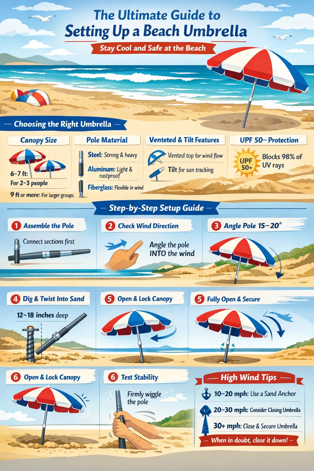 Acest ghid acoperă fiecare pas în detaliu - de la alegerea umbrelei de plajă potrivite până la menținerea stabilă în rafale de peste 20 mph - astfel încât să puteți petrece mai puțin timp luptând cu echipament și mai mult timp bucurându-vă de apă.