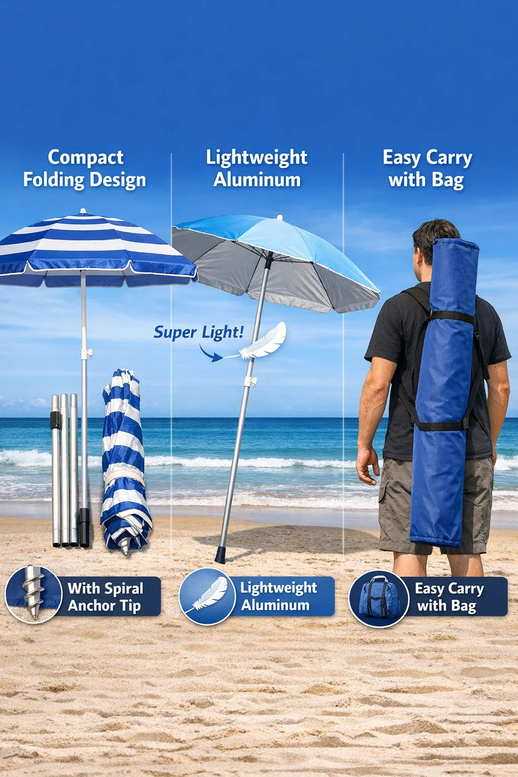 Avantaje: Acest tip de umbrelă de plajă nu este doar rezistent la rugină, ci și extrem de ușor, permițându-ți să o purtați cu o singură mână. Acest lucru este foarte convenabil pentru cei care au nevoie să transporte echipamente de la parcare la plajă.