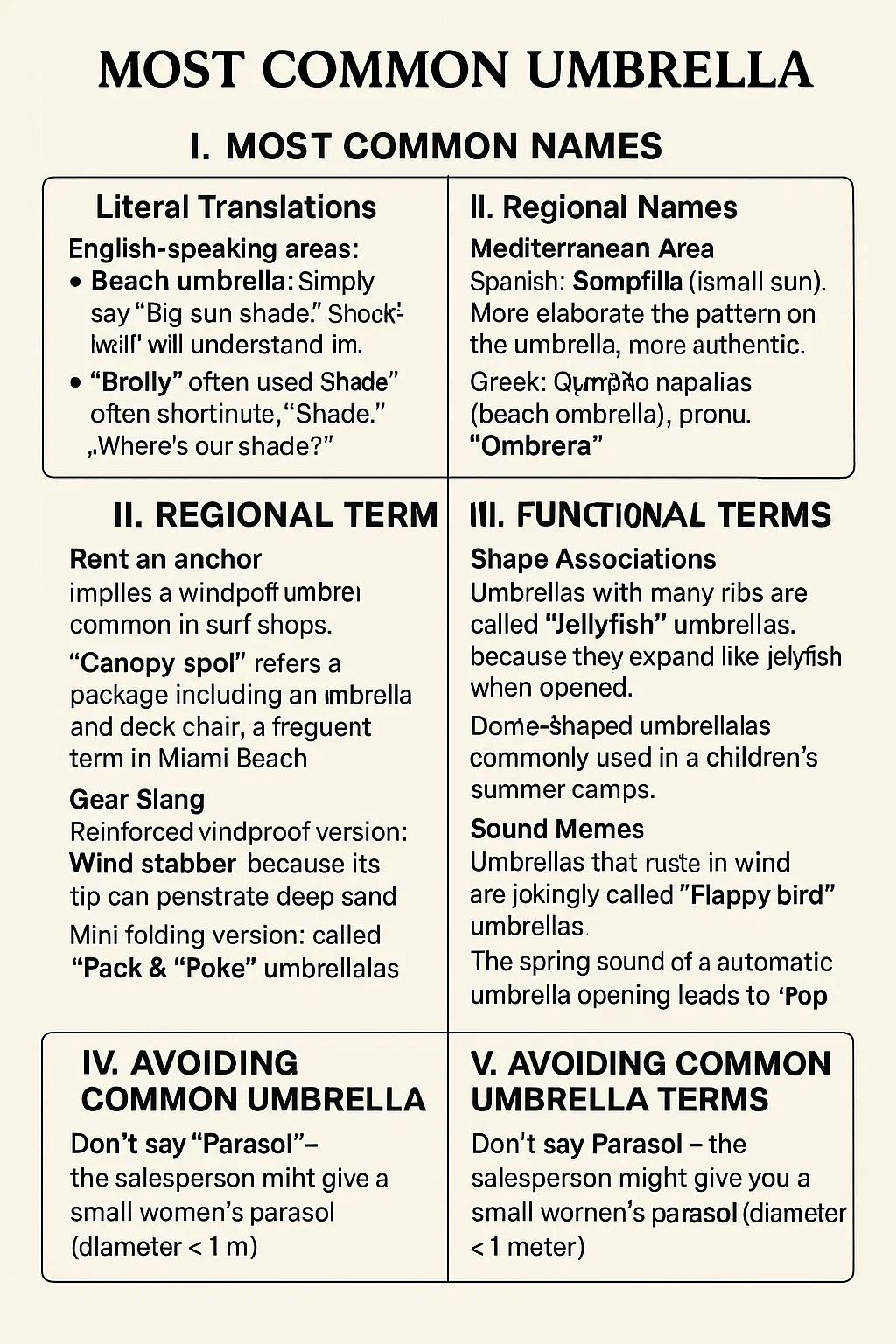 Iată nume comune pentru umbrele de plaja în contexte diferite: