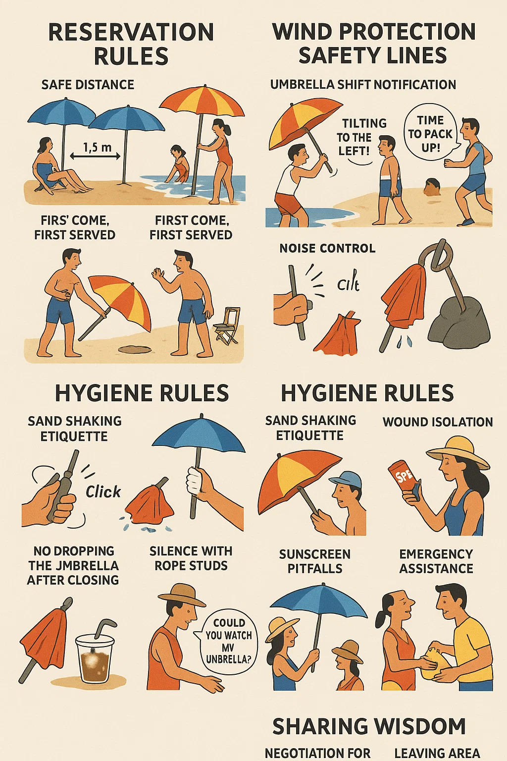 Eticheta de scuturare a nisipului: Înainte de a vă închide umbrela, agitați-o de trei ori într-o zonă retrasă pentru a evita ca nisipul să intre în sandvișurile altora.