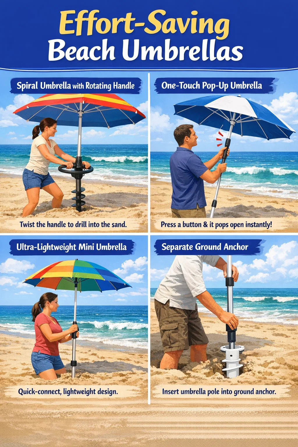Beneficiu de economisire a efortului: folosind principiul pârghiei, chiar și femeile sau persoanele în vârstă cu mai puțină forță pot îngropa cu ușurință umbrela adânc în nisip.