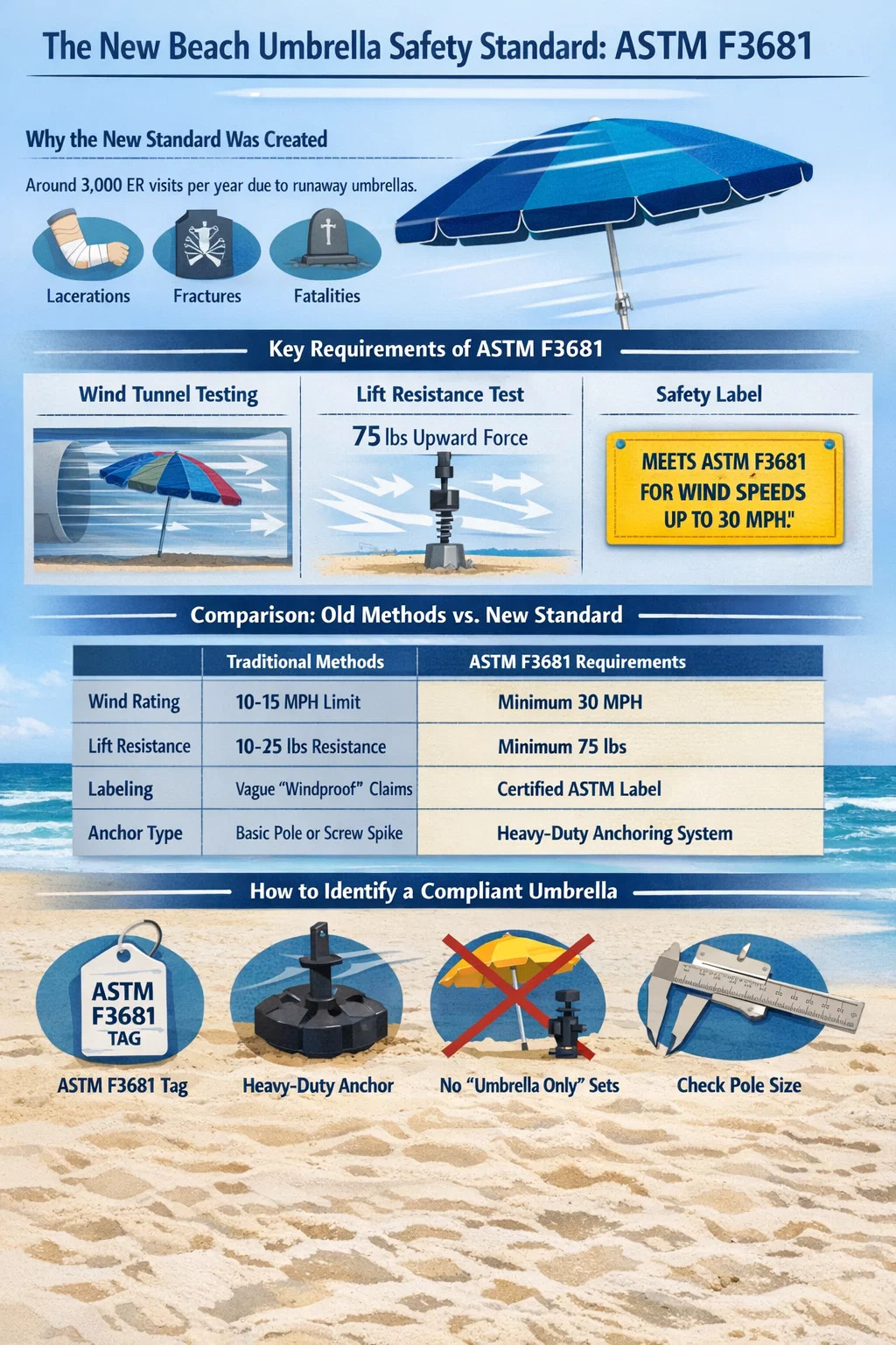 De zeci de ani, designul umbrela de plaja a fost lăsat în mare parte nereglementat, ducând la mii de răni în fiecare an. Datele Comisiei pentru Siguranța Produselor de Consum (CPSC) au indicat că aproximativ 3.000 de persoane sunt tratate în camerele de urgență anual din cauza rănilor provocate de umbrele fugare. Aceste incidente implică adesea că umbrela devine un proiectil periculos în rafale bruște, ducând la lacerații, fracturi și chiar decese. Standardul ASTM F3681 a fost dezvoltat pentru a forța o schimbare în industrie către mecanisme de ancorare testate științific.