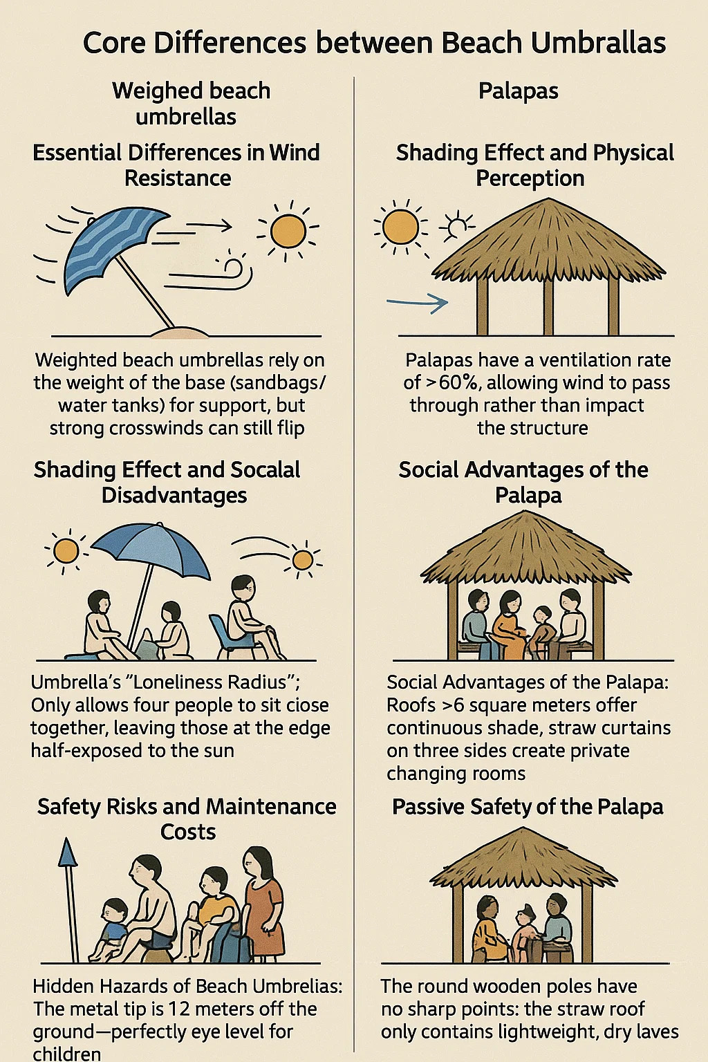 Limitări de protecție solară a umbrelelor de plajă: umbra de sub umbrelă se schimbă cu unghiul soarelui, necesitând reglaje frecvente. Acoperirea de argint reflectă în mod ineficient radiația de căldură de la sol, astfel încât chiar și la prânz, când suprafața de nisip este de 60 ° C, temperatura sub umbrelă poate depăși în continuare 40 ° C. Palapas oferă răcire naturală: frunzele de palmier îngroșate absoarbe căldura decât să o reflecte, menținând un nivel constant de umiditate (măsurat la plajă, cu 3-5 ° C mai mic decât sub umbrelă); Purta de soare completă nu necesită nicio ajustare.