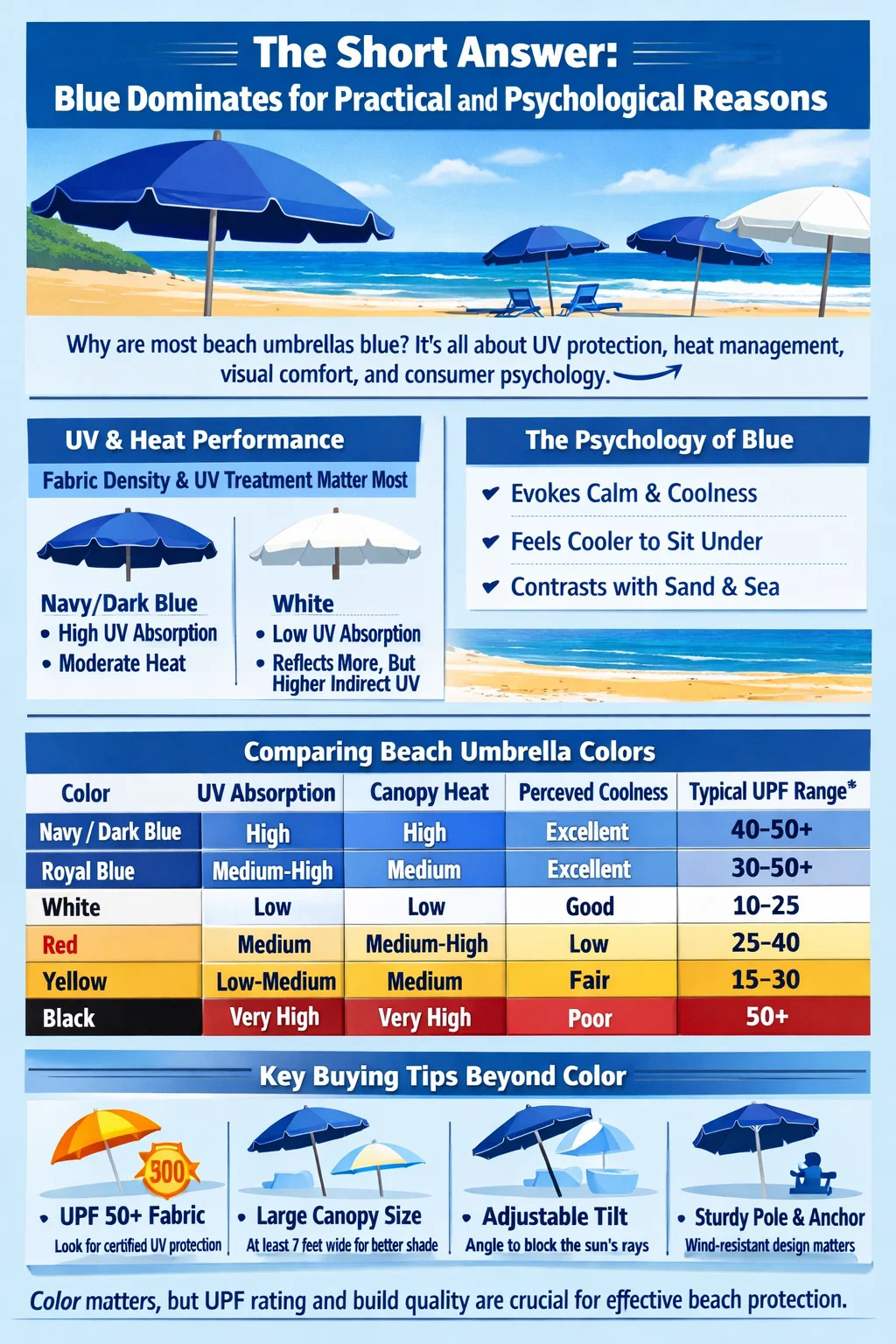Psihologia culorilor joacă un rol semnificativ în designul produsului, iar piața umbrelelor de plajă nu face excepție. Cercetările consumatorilor în domeniul produselor de agrement în aer liber constată în mod constant că albastrul evocă răcoare, calm și relaxare — asociații care se aliniază direct cu ceea ce cineva vrea să simtă când stă pe o plajă fierbinte.